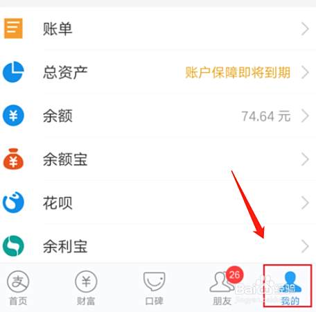 我们进入支付宝之后,然后在手机显示的页面上我们可以看到有一个”我的“选项,然后点击这个选项并进入。