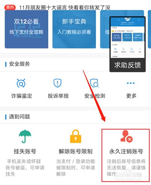 进入到安全中心以后我们找到“永久注销帐号”,直接点击进入,进入之后直接按照系统提示操作就可以注销支付宝账户了。