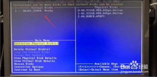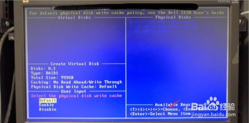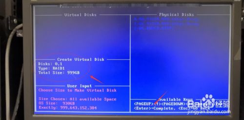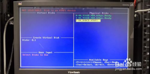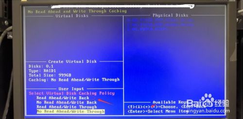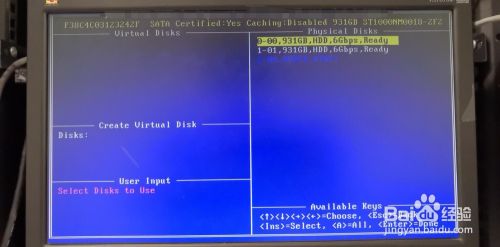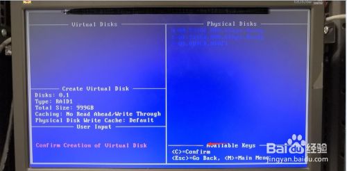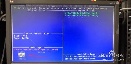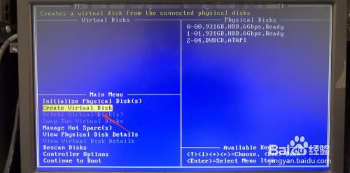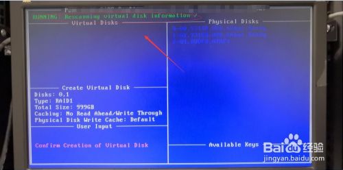 按完后,稍等一会进入raid阵列卡的配置界面,选择“create virtual disk”,按回车