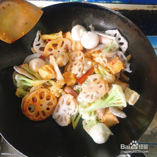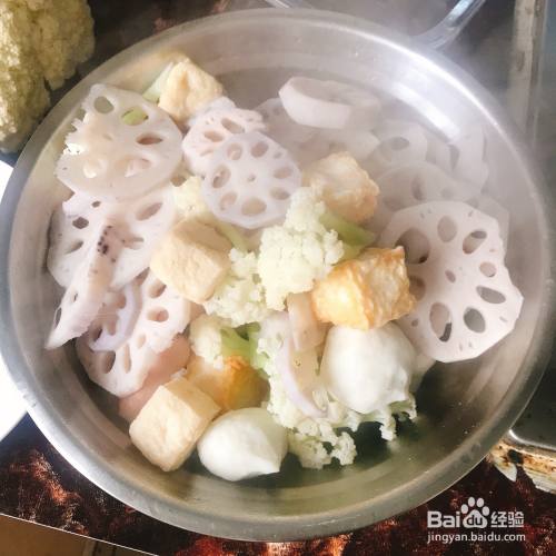 准备我们所需食材,藕切片,花菜切开,各种火锅丸子准备好