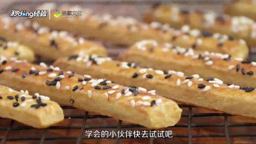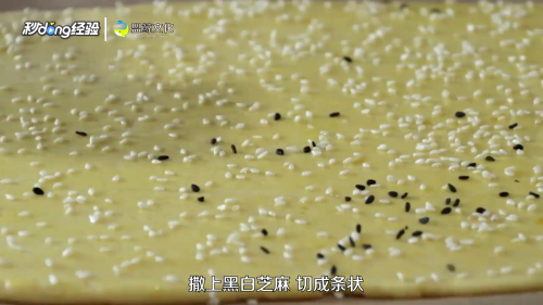 7撕掉油纸刷上一层蛋黄液,撒上黑白芝麻,切成条状。