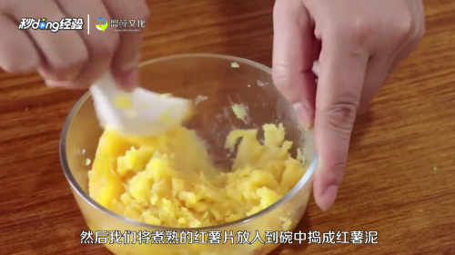 3将煮熟的红薯片放到碗中捣成红薯泥。