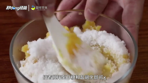 4趁热在红薯泥中加白糖和食用盐,搅拌至白糖和盐融化。