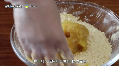 5在碗中倒入面粉和黄油,用手搓匀后,放入晾凉的红薯泥中,揉成面团。