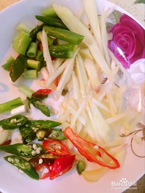 将姜切成丝,辣椒切成片备用,葱切成段备用。