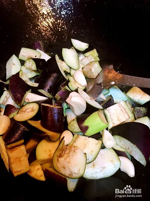 将茄子放入锅中,翻炒。