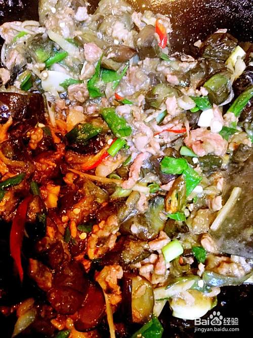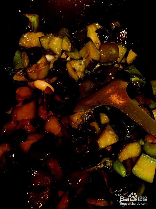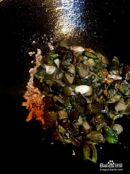 放入炒好的茄子,继续和匀翻炒。