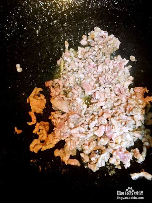 锅里放油,将肉炒散。