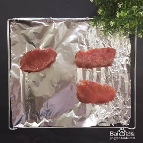 腌制好之后去掉葱姜蒜辣椒,里脊肉放至锡纸上。