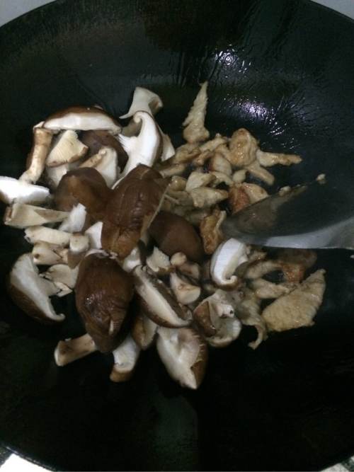 7香菇炒到快熟的时候加入角瓜,快速翻炒,加入盐和味精,一点酱油增色提味!