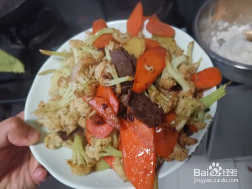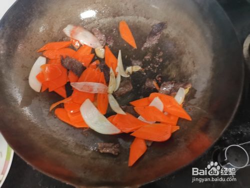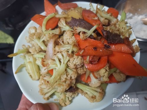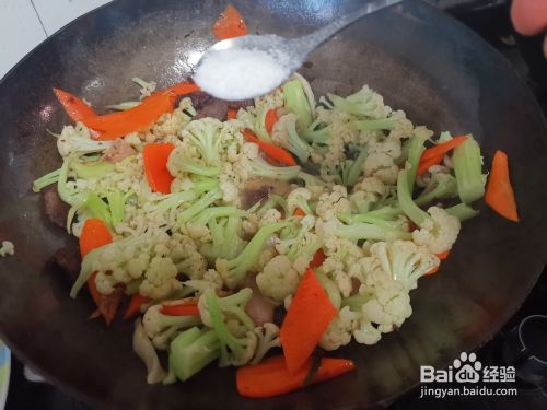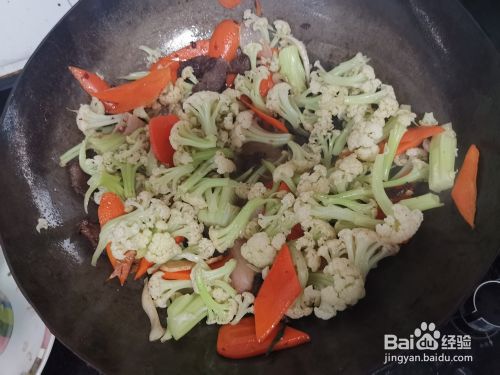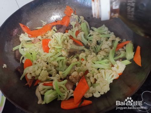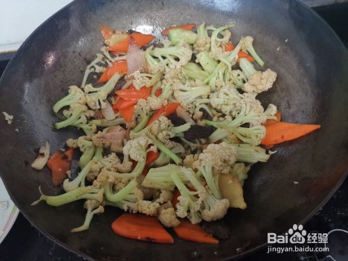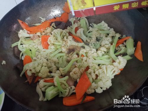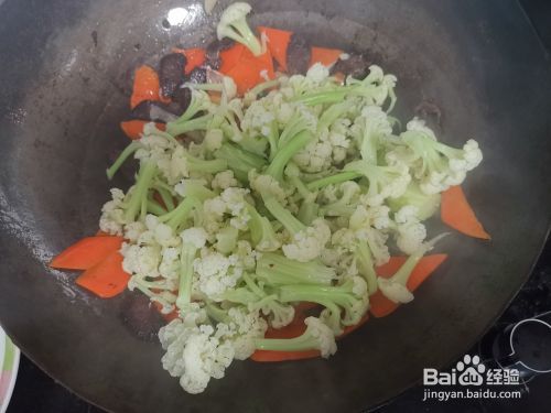 倒入切好的胡萝卜片继续翻炒,再下入焯过水的花菜