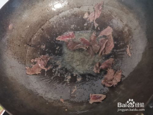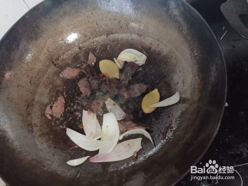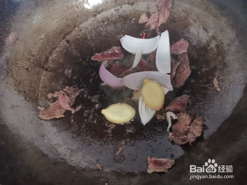 猪肉片下入锅中炒香变色,然后下入洋葱段继续翻炒出香味
