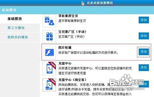 登入卖家中心——店铺装修,在右侧模块点击在此处添加新模块——添加“图片轮播”