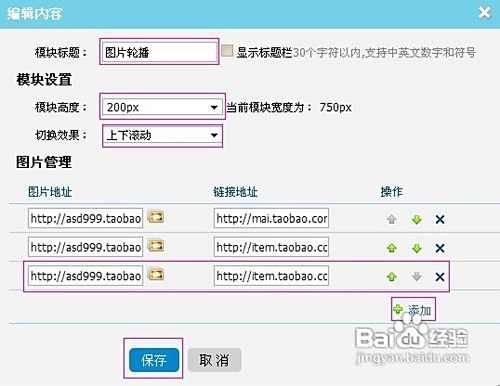 4.点击添加,可增添图片数量。将图片地址和连接地址(链接地址就是点击这张图片轮播,会跳到哪个宝贝详情页或其他页面)黏贴到指定区域。