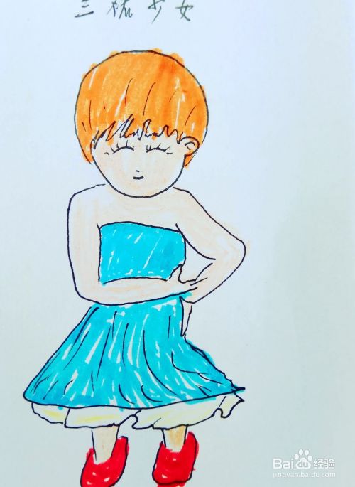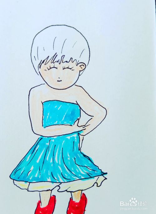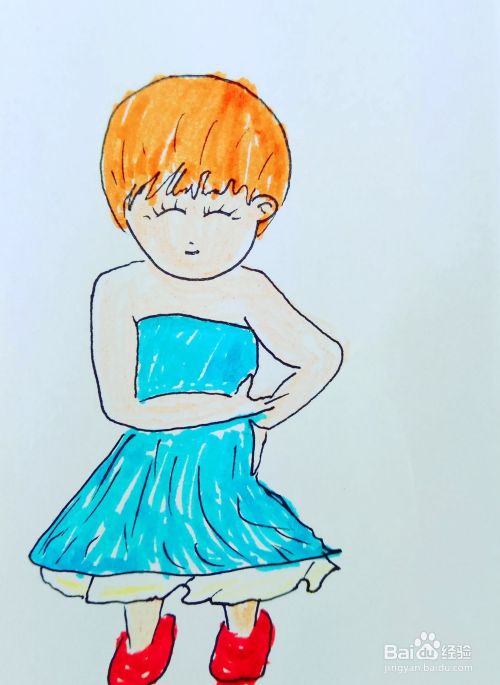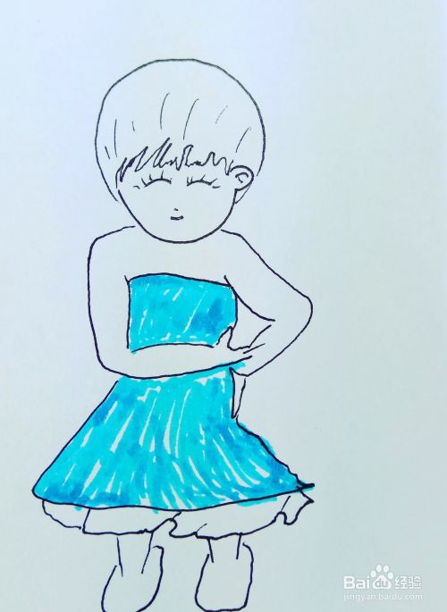 用蓝色的水彩笔涂出小女孩裙子的色彩,要注意涂得均匀一些,然后画出小女孩的脚。
