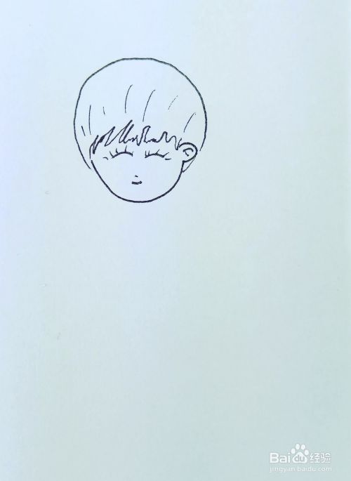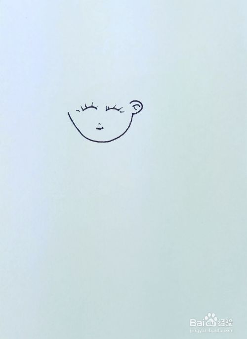在白纸上用圆珠笔画出小女孩的头部轮廓,并画出她的五官,包括眼睛,鼻子,嘴巴和耳朵等,要注意画出她的神态特征,她是在眯着眼微笑呢!