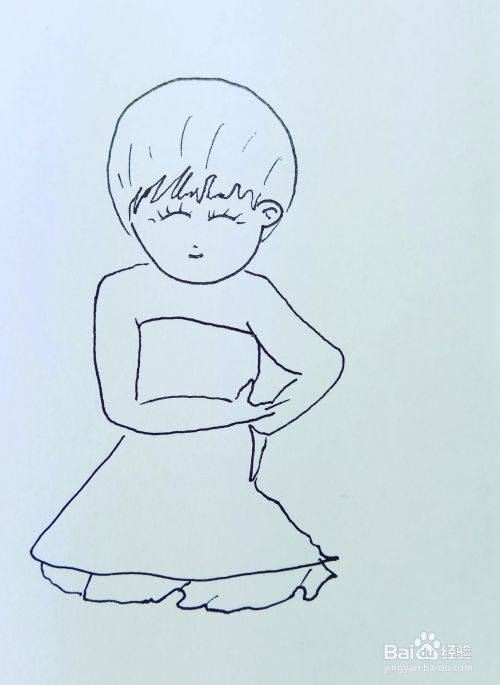 然后再用线条和弧线画出小女孩身上穿着的漂亮裙子,小女孩穿的裙子是露肩裙,显得非常漂亮!