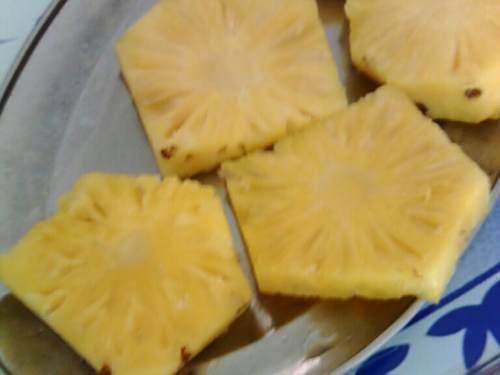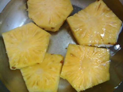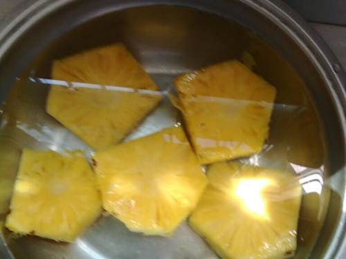 拿个铁盘子,装菠萝,花纹那面朝上,晾五分钟。