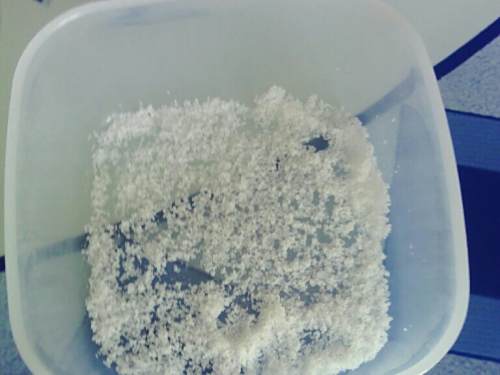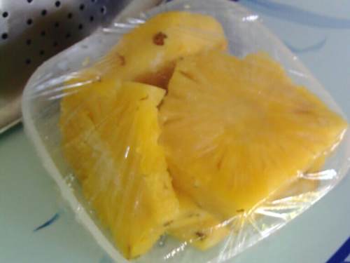铺一层菠萝,加一勺盐。做完后用保鲜膜盖住,盖上盖子,冰冻五分钟。