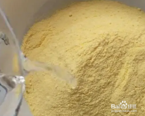 首先大碗中加入250克的玉米面用500毫升的开水烫面随倒随搅拌,烫过的玉米面口感更加细腻。