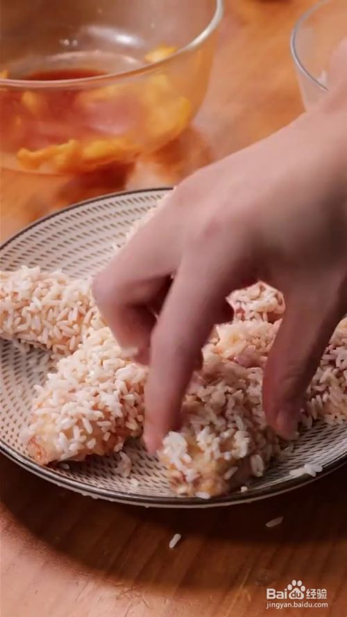 然后我们取出提前一晚上泡好的糯米粉,沥干水分,然后在鸡翅表面均匀地裹上糯米