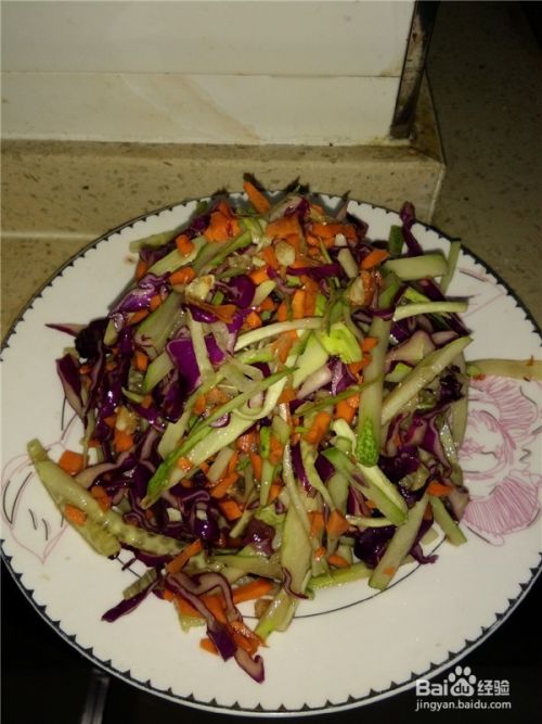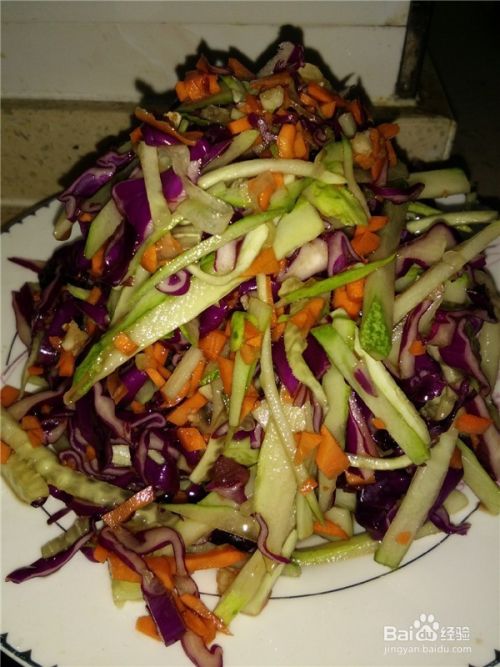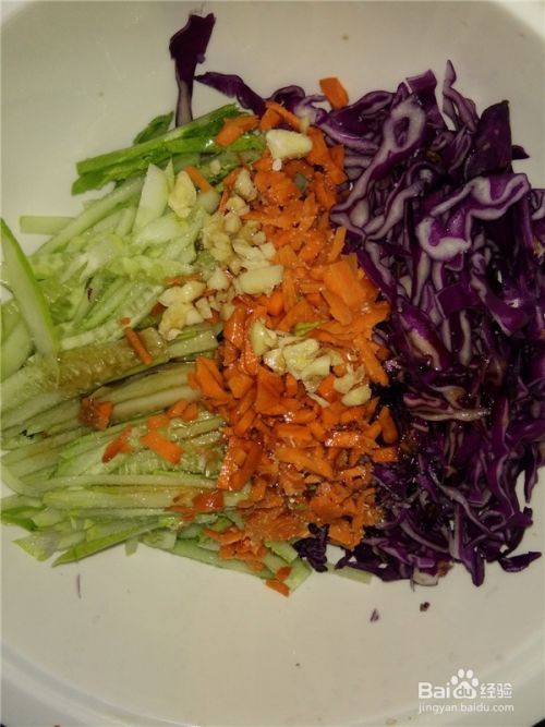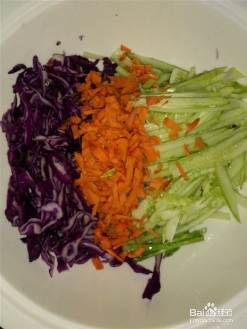 紫甘蓝和黄瓜切丝,胡萝卜切小粒。