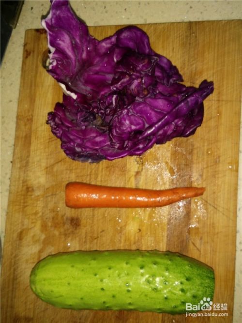 紫甘蓝两片,黄瓜一根,胡萝卜一根,洗净备用。