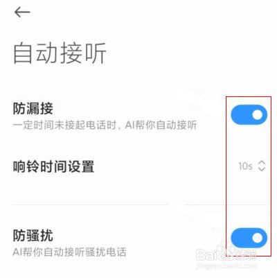 进入自动接听界面,关闭防漏接、防骚扰开关即可。