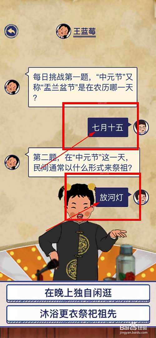第三题,“中元节”当天最好不要做什么?回答【在晚上独自闲逛】。