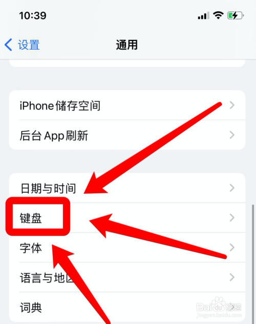 点开苹果手机通用设置页,进入“键盘”界面。