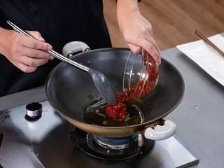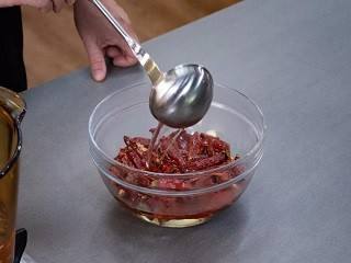 热油倒入干辣椒中,浸泡2分钟。