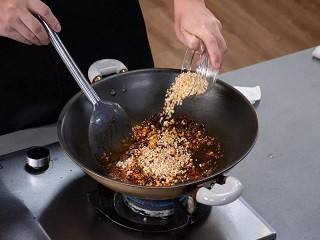加入碎花生、生抽、生姜和大蒜,炒匀。