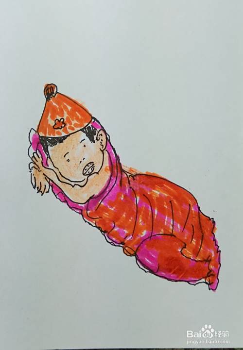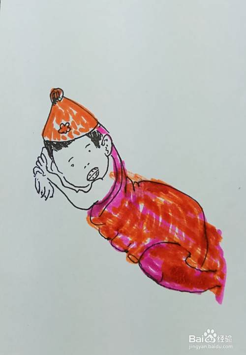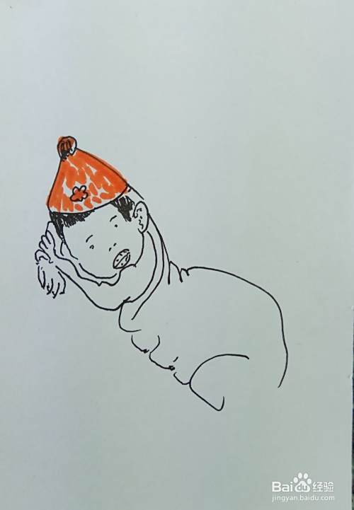 然后再用线条和曲线画出小孩的头部轮廓,并画出他的五官和头发,然后再用线条画出他的一个胳膊,他正在躺着呢。