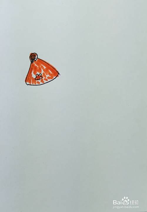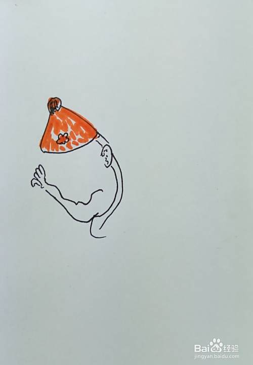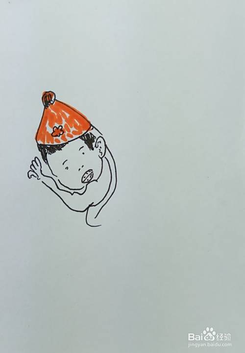 在白纸上用线条和曲线画出一个小孩的帽子,并且用水彩笔涂上色彩。