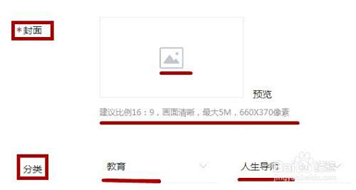 添加封面时,格式为16:9,画面清晰,最大5M,不少于660*370像素。选好视频所属的分类。也可以点击【系统截取视频图片】。