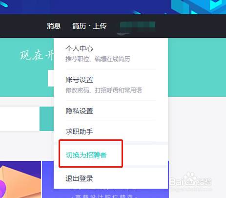 步骤五:注册成功以后,我们会发现我们注册的是求职者账户,然后我们点击头像,个人中心,在下拉的位置选择转换成招聘者。