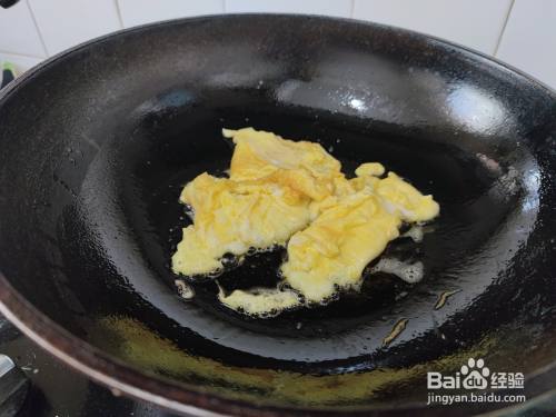 锅中倒入食用油,烧至七分开,放入蛋液摊饼,炒成块出锅备用。