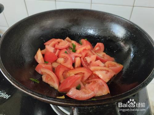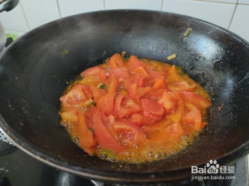 锅中剩底油,放入西红柿煸炒,放入葱,姜爆香,放入适量盐,白煸炒。