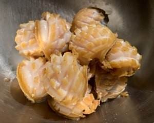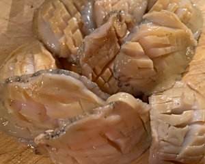 2、将鲍鱼从壳中取出,去杂质,清洗干净,,在正面切花刀。