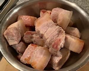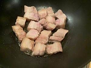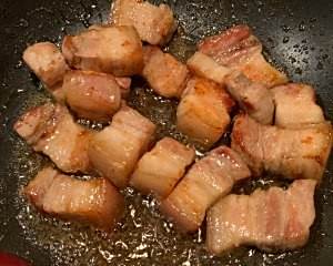 4、不粘锅中倒入适量油,烧热后倒入五花肉块,煎至表面金黄。