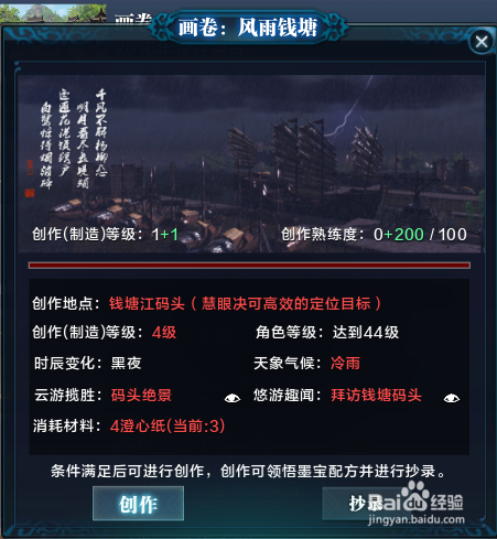 画卷:风雨钱塘,创作地点:钱塘江码头,可直接传送至钱塘江码头传送点,进行书画的创作。