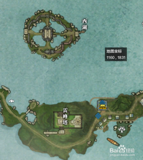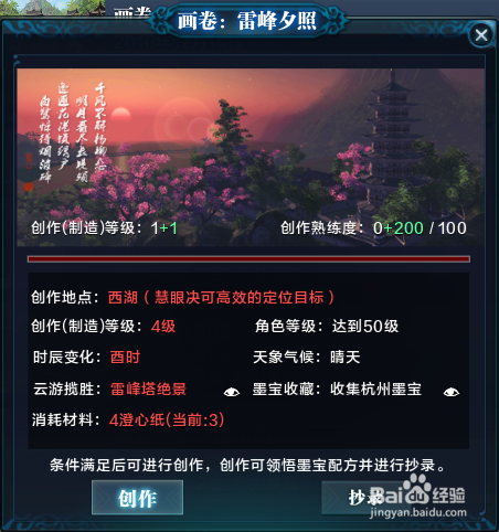 画卷:雷峰夕照,创作地点:西湖,可以直接选择雷峰塔传送点进行传送后,进行书画的创作。