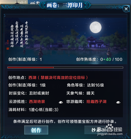 画卷:三潭映月,创作地点:西湖,可以选择周边的金房子进行传送,或者选择雷峰塔传送点进行传送,移动至西湖湖心岛范围内进行书画创作。