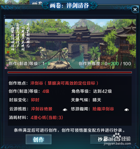 画卷:淬剑谷,创作地点:淬剑谷,可直接选择淬剑谷传送点进行传送,并进行书画的创作。