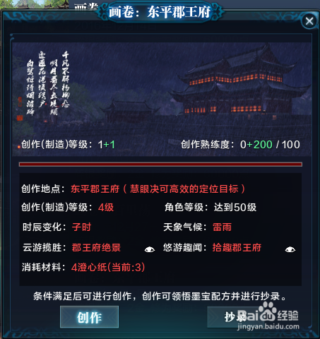 画卷:东平郡王府,创作地点:东平郡王府,可以传送至红衣林传送点后,移动至东平郡王府范围内进行创作。