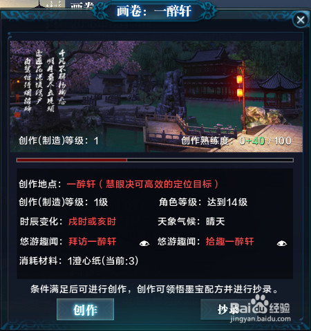 画卷:一醉轩,创作地点:一醉轩,可以选择凤凰集或淬剑谷进行传送,移动到一醉轩的范围内进行书画创作。