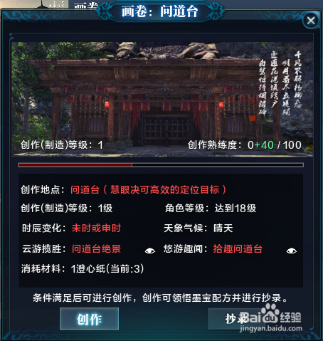 画卷:问道台,创作地点:问道台,可以直接选择问道台传送点进行传送并进行书画的创作。