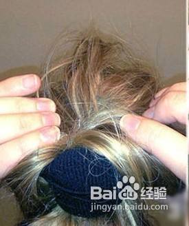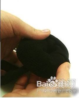 然后把发尾尽量均匀的分散开,一缕一缕的向外包裹住丝袜圆环,将发梢塞到圆环下。然后开始把圆环往下卷,让剩下的头发都包裹在圆环上。不用担心头发是否均匀,因为当你开始卷了以后你的头发就会自然的分散开包裹住丝袜,你只管的把头发卷起来就可以了。