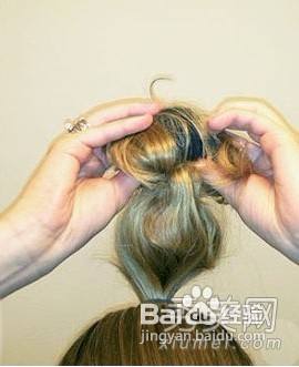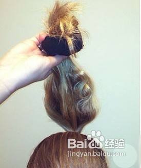 扎起一个马尾,根部可以在脑后或头顶任何你喜欢的位置。将马尾辫的发梢穿过丝袜圆环。