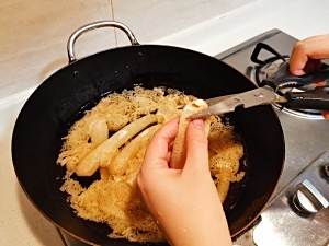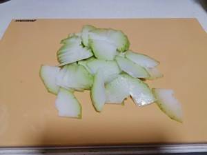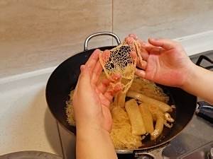 竹荪的伞裙也是味道集中的地方,也去掉。竹荪泡开后要多洗几遍,把身上的白膜洗掉,再剪成小段。